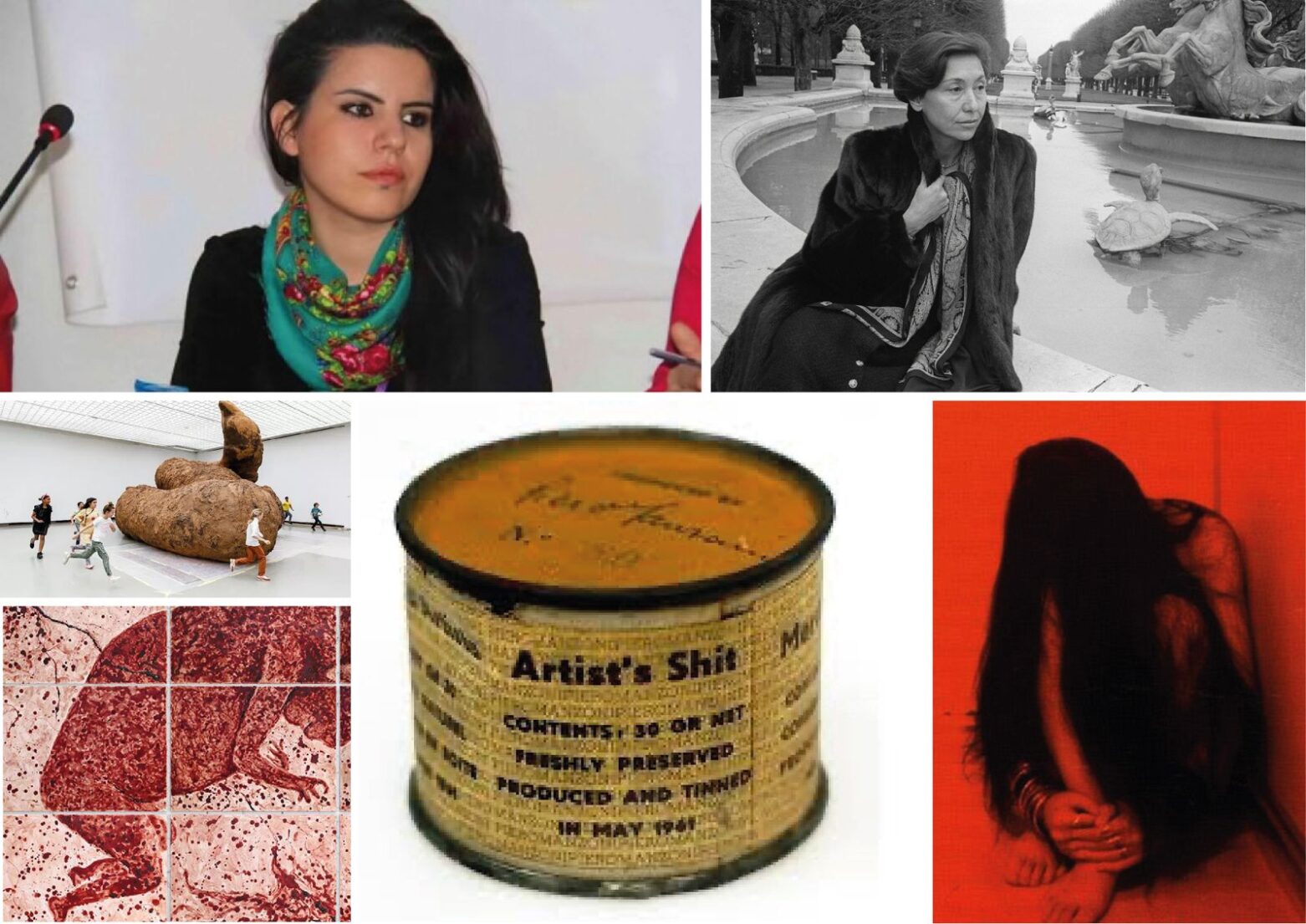 Chiris Ofili, ji rêxa fîlekî Meryema Pîrozwer a Xama, Andres Serrano, ji gûyê xwe ‘xweportre’yek, her weha Piero Manzoni jî ji gûyê xwe rêzekonserve, hunermend Marc Quinn, ji xwîna xwe portreyek çêkiribû, belam şilemeniyên hunermendên “nêr”, temet şilemeniyên hunermendên “mê”, navdar nedibûn. Aya hunermend çima dev ji kereseyên xwe yên gerdîşî berdabûn? Çima xwestibûn –û hewl dabûn– wekî sînorên şêwekariyê û hunerê veguherînin? Yeqîn hunermend mafdar bûn, bi her kereseyê huner dihate kirin, çima bi şilemeniyên laşî nedihat kirin?
